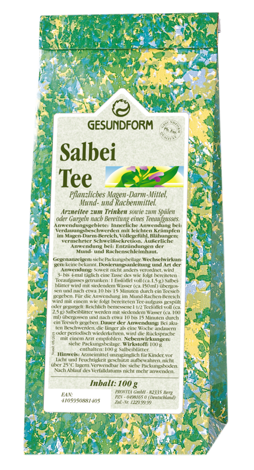 wird mit siedendem Wasser (ca. 150 ml) übergossen und nach etwa 10 bis 15 Minuten durch ein Teesieb gegeben. Für die Anwendung im Mund-Rachen-Bereich wird mit einem wie folgt bereiteten Teeaufguss gespült oder gegurgelt: Reichlich bemessene 1 1/2 Teelöffel voll (ca. 2,5 g) Salbeiblätter werden mit siedendem Wasser (ca. 100 ml) übergossen und nach etwa 10 bis 15 Minuten durch ein Teesieb gegeben.